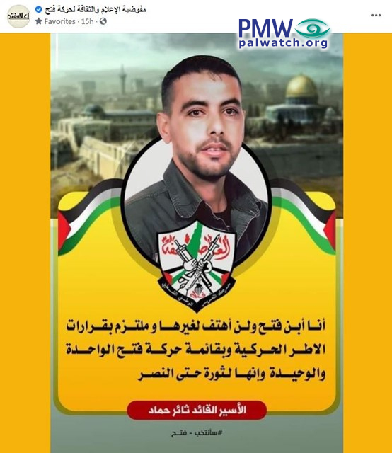 The image shows terrorist Thaer Hammad, who murdered 10. Below Hammad is the Fatah logo that includes a grenade, crossed rifles, and the PA map of “Palestine” that presents all of Israel together with the PA areas as “Palestine”; in the background is the Temple Mount with the Dome of the Rock and the Al-Aqsa Mosque.