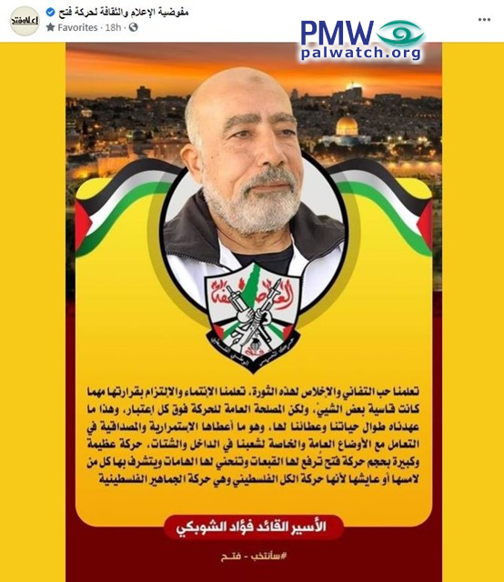 Posted text: “We learned what absolute love of devotion and loyalty to this revolution is… A magnificent and great movement like the Fatah Movement – people tip their hats to it and nod to it…