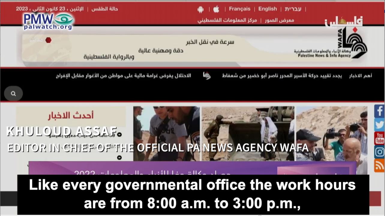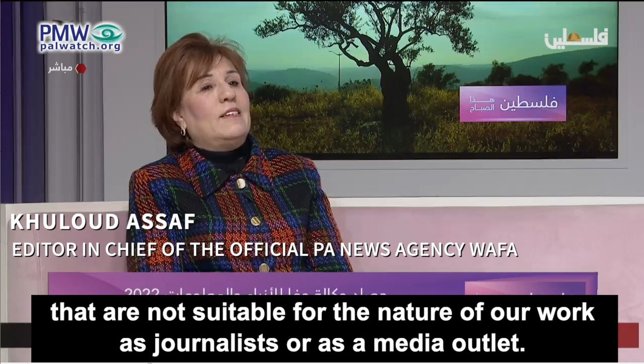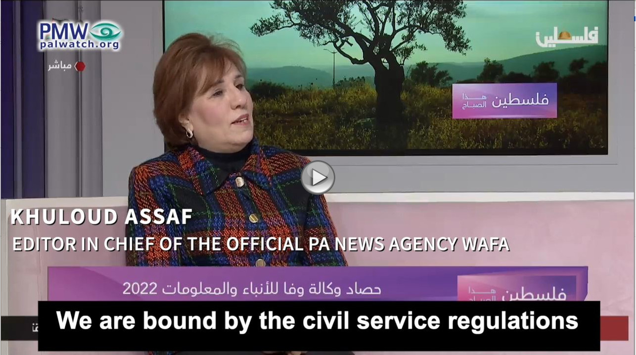 Editor in Chief of the official PA news agency WAFA Khuloud Assaf provided additional proof of the lack of independence of official PA media institutions, explaining that WAFA - as well as the rest of PA media - functions as a “governmental office”: