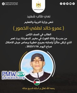 From the [UN] Relief [and Works] Agency [for Palestine Refugees in the Near East] (UNRWA) School in the Deheisheh [refugee] camp in Bethlehem, who died as a Martyr as a result of being severely wounded by the occupation army’s bullets