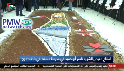 Official PA TV newsreader: “In Tubas, the [local] Education Directorate (i.e., branch of the PA Ministry of Education) and the [PA-funded] Prisoners’ Club organized a national exhibition at the Muscat School in Tamoun in honor of Martyr Nasser Abu Hmeid (i.e., terrorist, responsible for murder of 7), and in preparation for receiving prisoner Karim Younes (i.e., terrorist, murdered 1 together with an accomplice).”