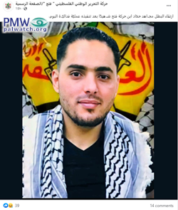Posted text: “Hero Mujahid Hammad (i.e., terrorist, shot at Israeli soldiers), a member of the Fatah Movement, ascended to Heaven as a Martyr after carrying out a self-sacrificing operation today [Dec. 7, 2022].”