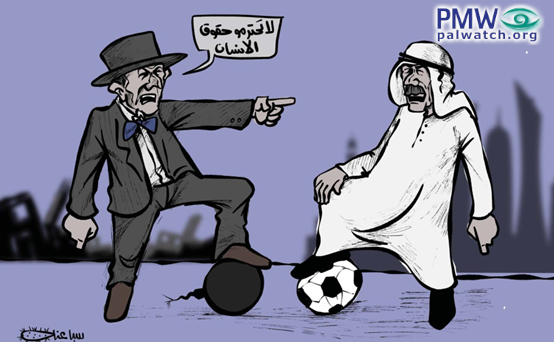 The cartoon shows a man representing the West standing on the left with his foot resting on a bomb, who is pointing an accusing finger at an Arab man standing on the right with his foot resting on a football. The man representing the West is saying: “You do not respect human rights”