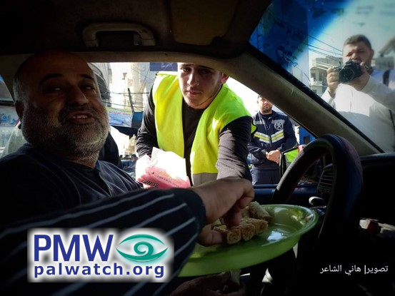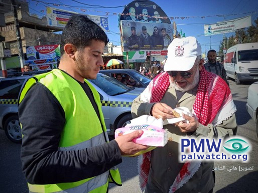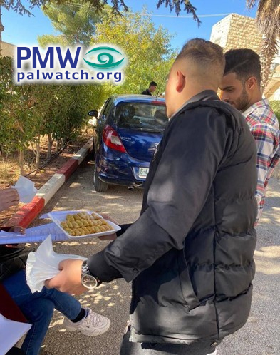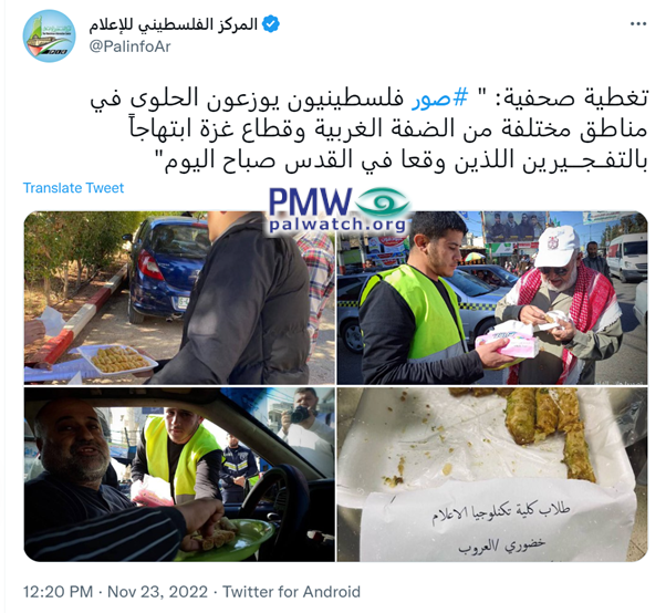 Posted text: “Journalistic coverage: ‘Pictures of Palestinians distributing candies in various areas of the West Bank and Gaza Strip, as a sign of joy over the two explosions that took place in Jerusalem this morning [Nov. 23, 2022] (refers to terror bombings, 1 murdered and 18 wounded; see note below -Ed.)’”