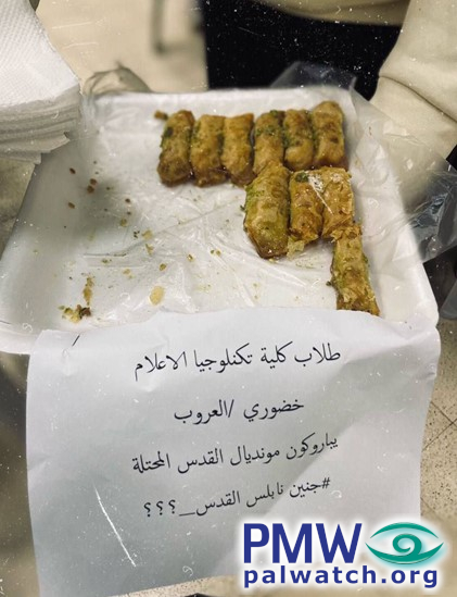 Text on paper: “Students of [Palestine] Technical University – Kadoorie / Al-Aroub [branch] send congratulations over the occupied Jerusalem World Cup (i.e., a reference to recent terror attacks taking place in Jerusalem during the World Cup). Jenin – Nablus – Jerusalem - ??? (“???” apparently insinuates the next attack could be anywhere -Ed.)”