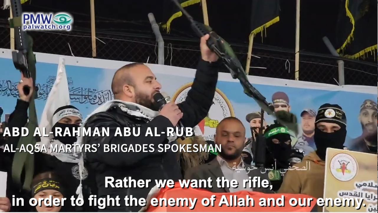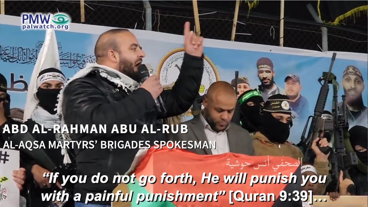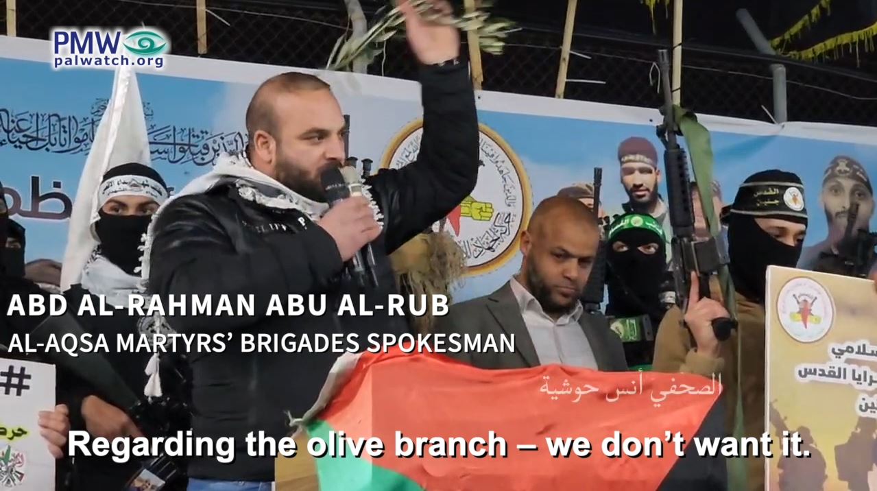 Abu Al-Rub emphasized this in a speech by dramatically throwing an olive branch to the ground and grabbing a rifle, while stating that the goal now is “to fight the enemy of Allah and our enemy.” Abu Al-Rub also added a religious component, threatening “those who do not mobilize for Allah” to fight Israel with a “painful punishment”: