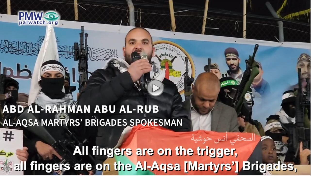 The Al-Aqsa Martyrs’ Brigades – an internationally designated terror organization – is an integral part of Fatah. Fatah, including its terror wing that is now openly advocating to carry out terror attacks and murder Israelis, is headed by PA Chairman Mahmoud Abbas.