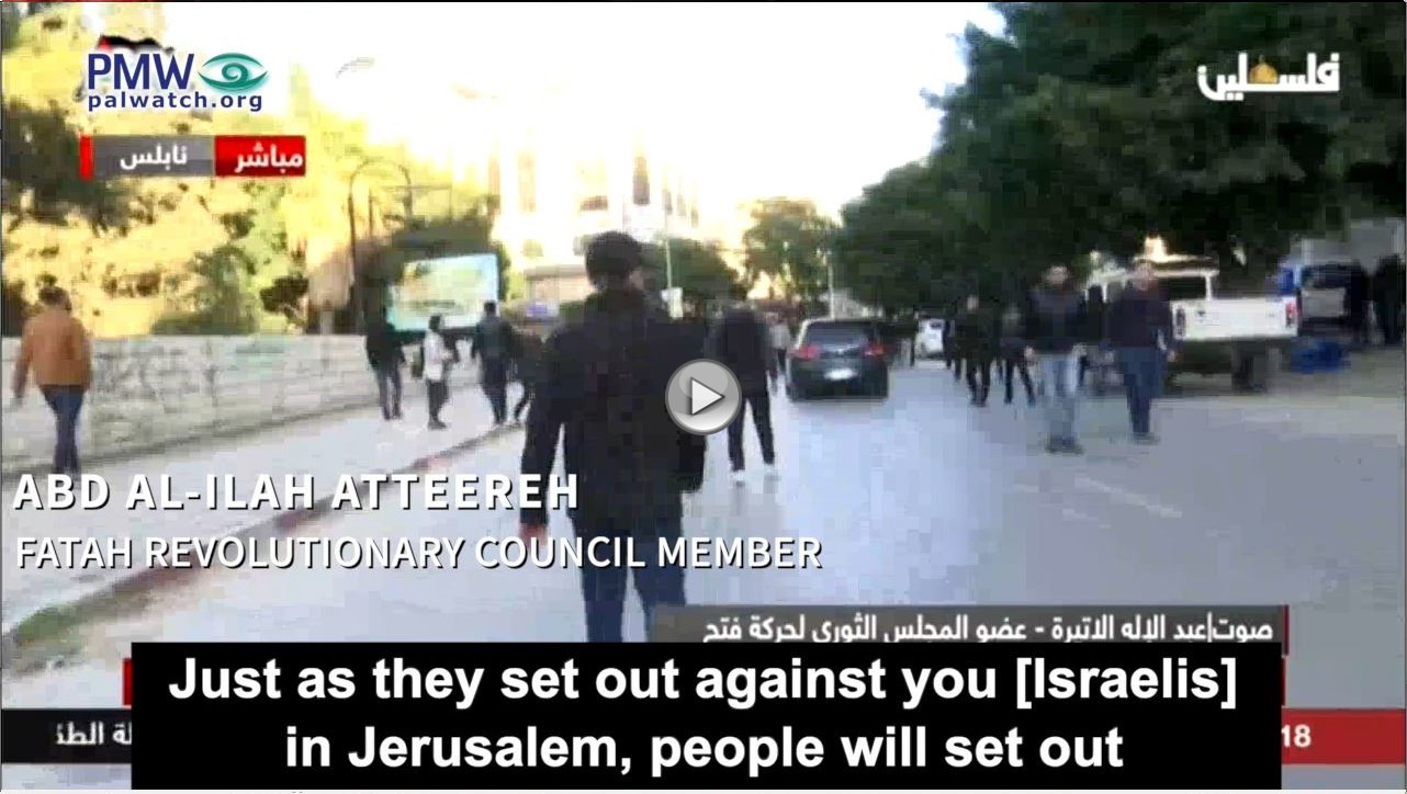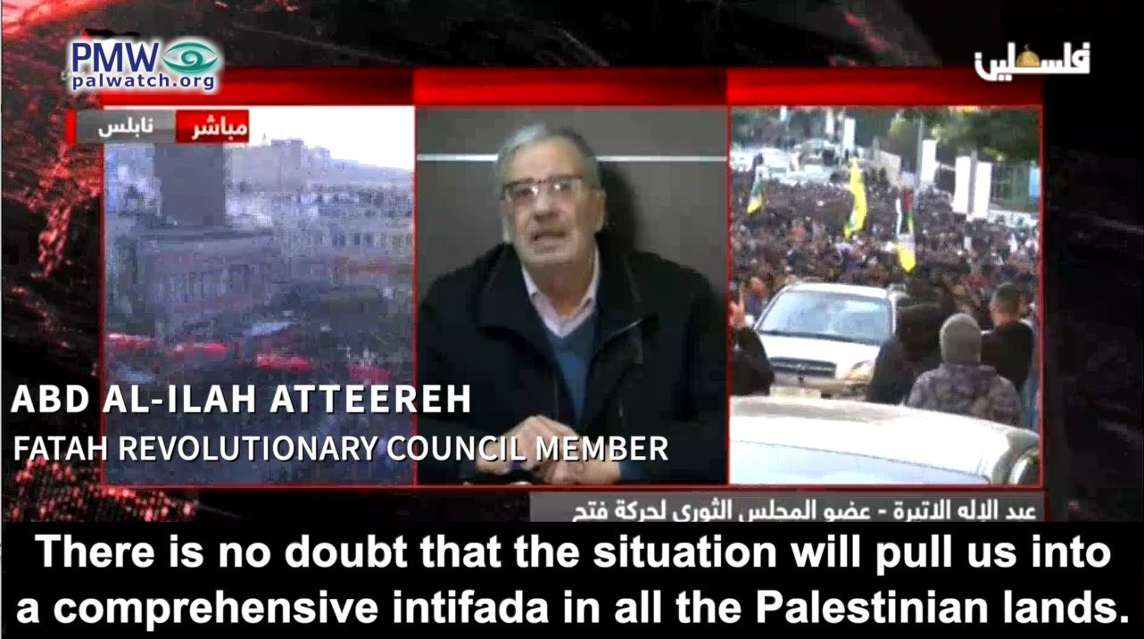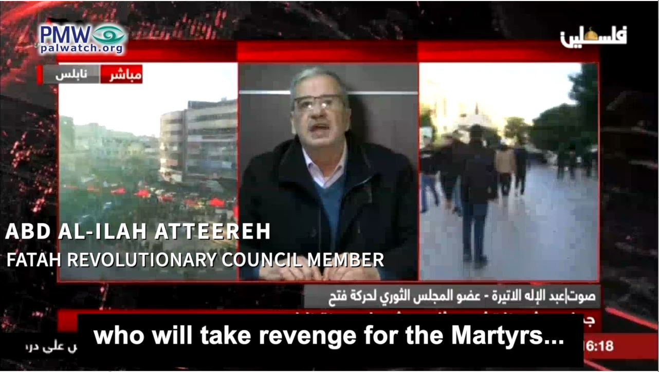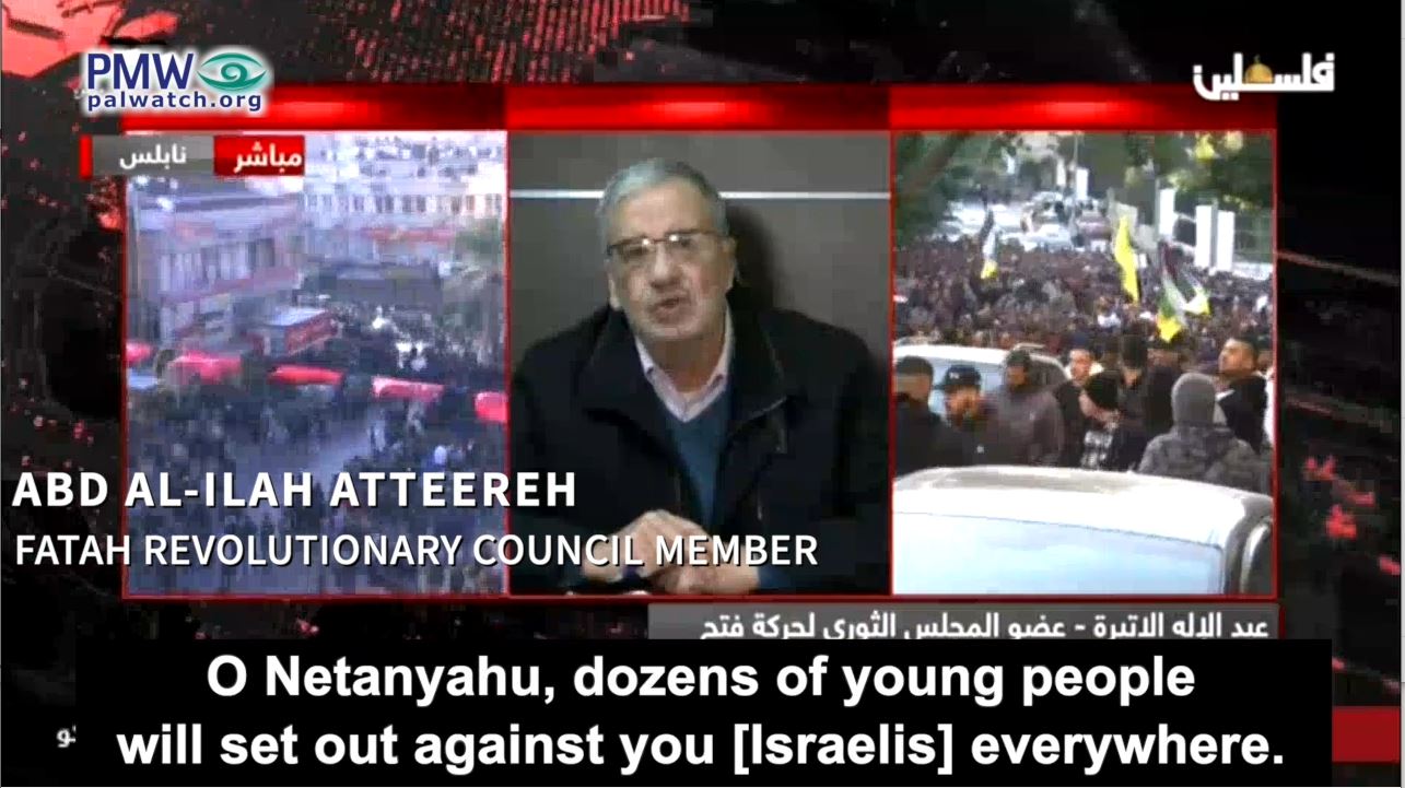 Fatah Revolutionary Council member Abd Al-Ilah Atteereh: “Just as they set out against you [Israelis] in Jerusalem, people will set out who will take revenge for the Martyrs... Every time there is a Martyr, there will also be a [new] self-sacrificing fighter. Every time there is a Martyr, there will be one who will carry out various kinds of resistance against you… There is no doubt that the situation will pull us into a comprehensive intifada in all the Palestinian lands. O Netanyahu, dozens of young people will set out against you [Israelis] everywhere.”