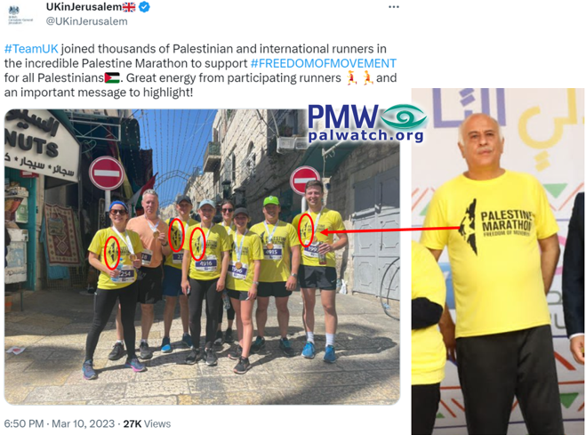 The tweet accompanying the pictures that declared “#TeamUK joined thousands of Palestinian and international runners in the incredible Palestine Marathon to support #FREEDOMOFMOVEMENT for all Palestinians,” was no less egrerious.