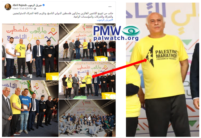 On March 10, 2023, the Palestinian Authority held the annual “Palestine Marathon”. The marathon was held under the auspices of the PLO Supreme Council for Youth and Sports, which is headed by Jibril Rajoub. The official PA logo of the marathon, printed on marathon t-shirts, is a map of “Palestine” that entirely erases Israel. Rajoub was seen wearing the t-shirt at the concluding ceremony in pictures he posted on his Facebook page: