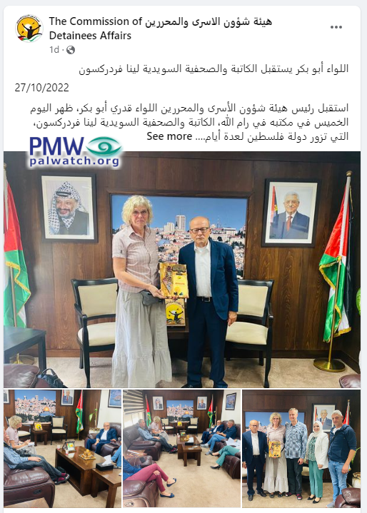 Posted text: “[Director of PLO Commission of Prisoners’ Affairs Qadri] Abu Bakr welcomed Swedish author and journalist Lena Frederiksson.”