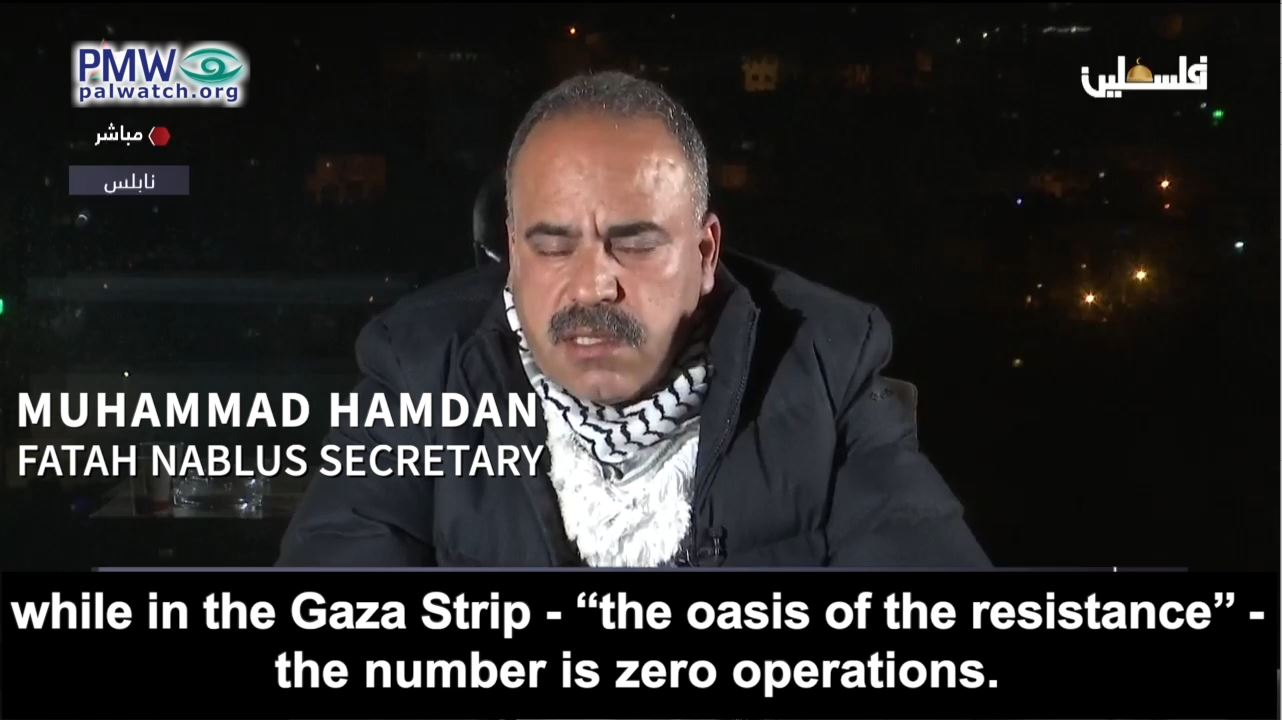 Fatah Nablus Secretary Muhammad Hamdan: “Hamas is accusing the West Bank of security coordination [with Israel]. I think that the entire Palestinian people and the whole world has [recently] seen that more than 1,500 military operations (i.e., terror attacks) against the Israeli occupation were led by the Fatah Movement members and the [PA] Security Forces members, while in the Gaza Strip - ‘the oasis of the resistance’ - the number is zero operations.”