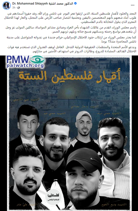 The image above shows the 6 terrorists nicknamed “the six moons of Palestine.” It was shared by PA Prime Minister Muhammad Shtayyeh and PA Supreme Shari’ah Judge of Palestine and PA Chairman Mahmoud Abbas’ Advisor on Religious Affairs and Islamic Relations Mahmoud Al-Habbash: