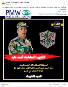 Posted text: “One of the moons of Jenin and one of those who ascended to Heaven while fighting the occupation forces is Martyr Ahmed Abed (i.e., terrorist, murdered 1 together with an accomplice), a member of the Palestinian [PA] military intelligence