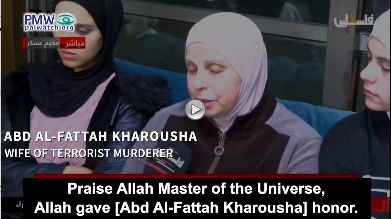 Wife of terrorist murderer Abd Al-Fattah Kharousha: “Praise Allah Master of the Universe, Allah gave [Abd Al-Fattah Kharousha] honor. He achieved Martyrdom. He wanted to meet Allah, and Allah wanted to meet him, praise Allah Master of the Universe. I congratulate myself for my husband’s Martyrdom.”