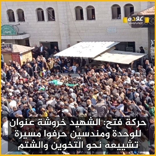 Posted text: “The Fatah Movement: Martyr [Abd Al-Fattah] Kharousha (i.e., terrorist, murdered 2) is a symbol of unity, and planted people attempted to incite his funeral procession in the direction of accusations of treason and curses.