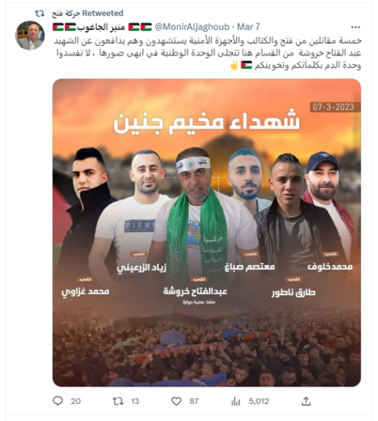 “In a statement from the [Fatah] Commission of Information, Culture, and Ideology, the Fatah Movement eulogized the Martyrs of the massacre in Jenin.It called to escalate the resistance to the occupation, its army, and its settlers.”