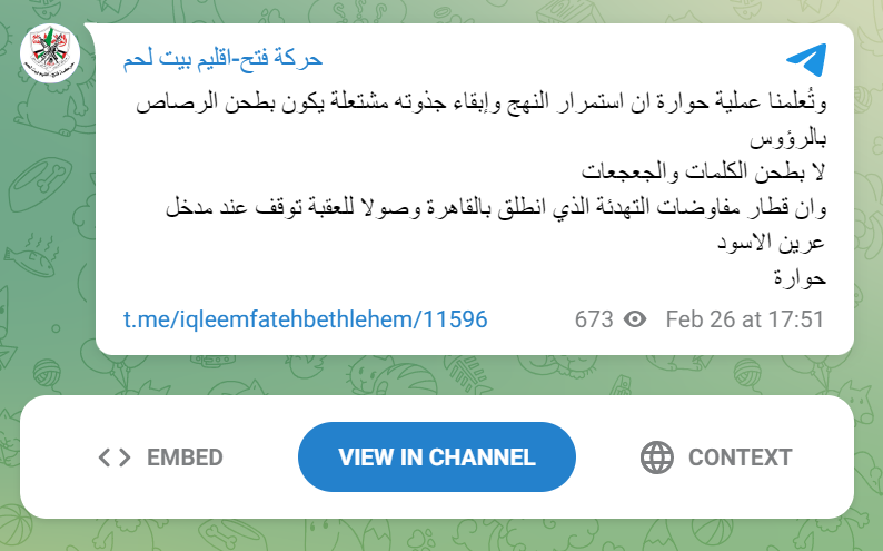 [Fatah Movement – Bethlehem Branch, Telegram channel, Feb. 26, 2023]