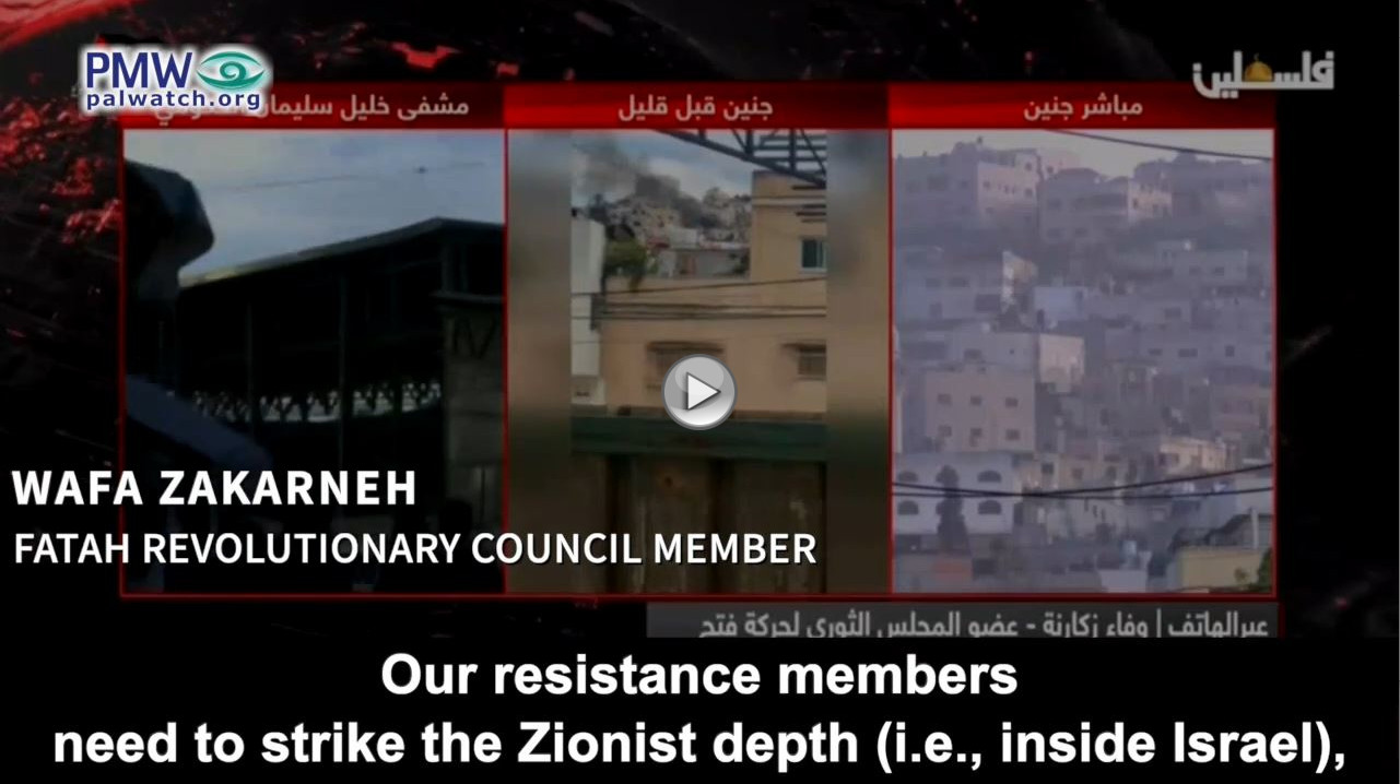 Similarly, during a broadcast about the gun battle in Jenin during which terrorist Abd Al-Fattah Kharousha who murdered the Yaniv brothers was killed, Fatah Revolutionary Council member Wafa Zakarneh called for more terror deep inside Israel: