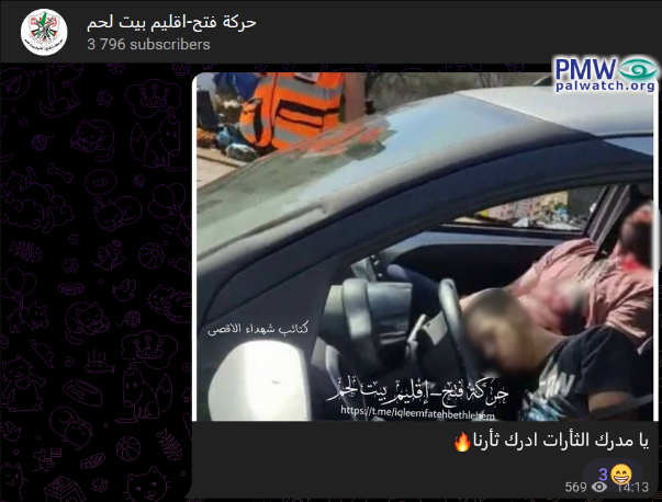 Fatah’s branch celebrated the murder of the Yaniv brothers by posting this picture of them shot in their car at the scene of the attack. PMW has blurred the picture.