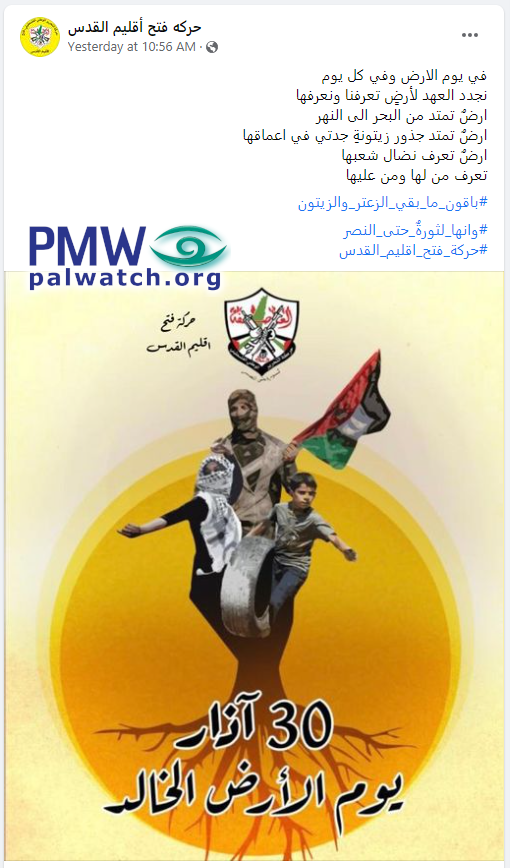 Posted text: “On Land Day and every day we renew the pledge to the land that knows us and we know it, a land thatstretches from the [Mediterranean] Sea to the [Jordan] River, a land where the roots of my grandmother’s olive tree are entrenched in its depths, a land that knows its people’s struggle and knows who belongs to it and who is on it.”