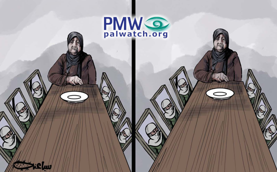 The cartoon contains two panels (read from right to left) showing Um Nasser Abu Hmeid, the mother of terrorists responsible for at least 10 murders, sitting at a table together with six framed pictures of masked men, representing her six imprisoned and dead terrorist sons. In the right panel, one of the pictures has a black ribbon on it indicating her dead son Abd Al-Mun'im Abu Hmeid, and in the left panel there are two pictures with black ribbons on them, indicating the additional death of her son Nasser Abu Hmeid who died of cancer while imprisoned.