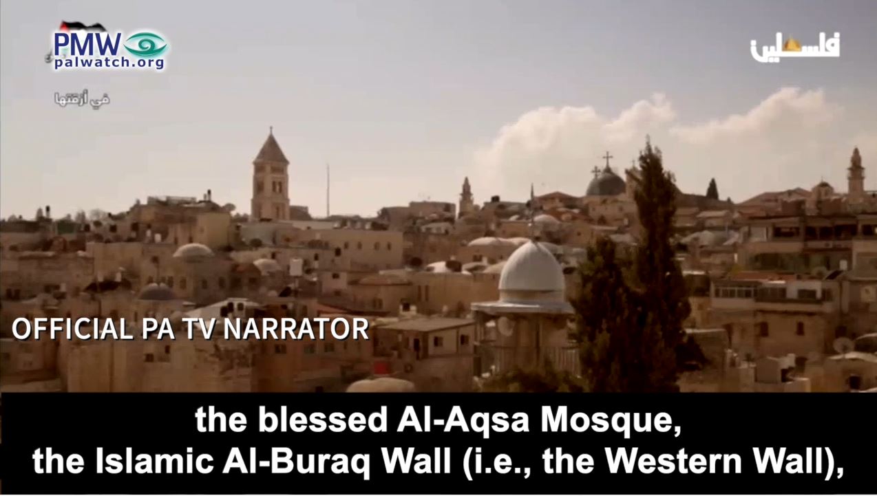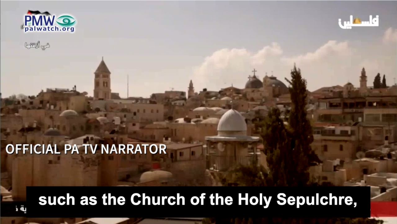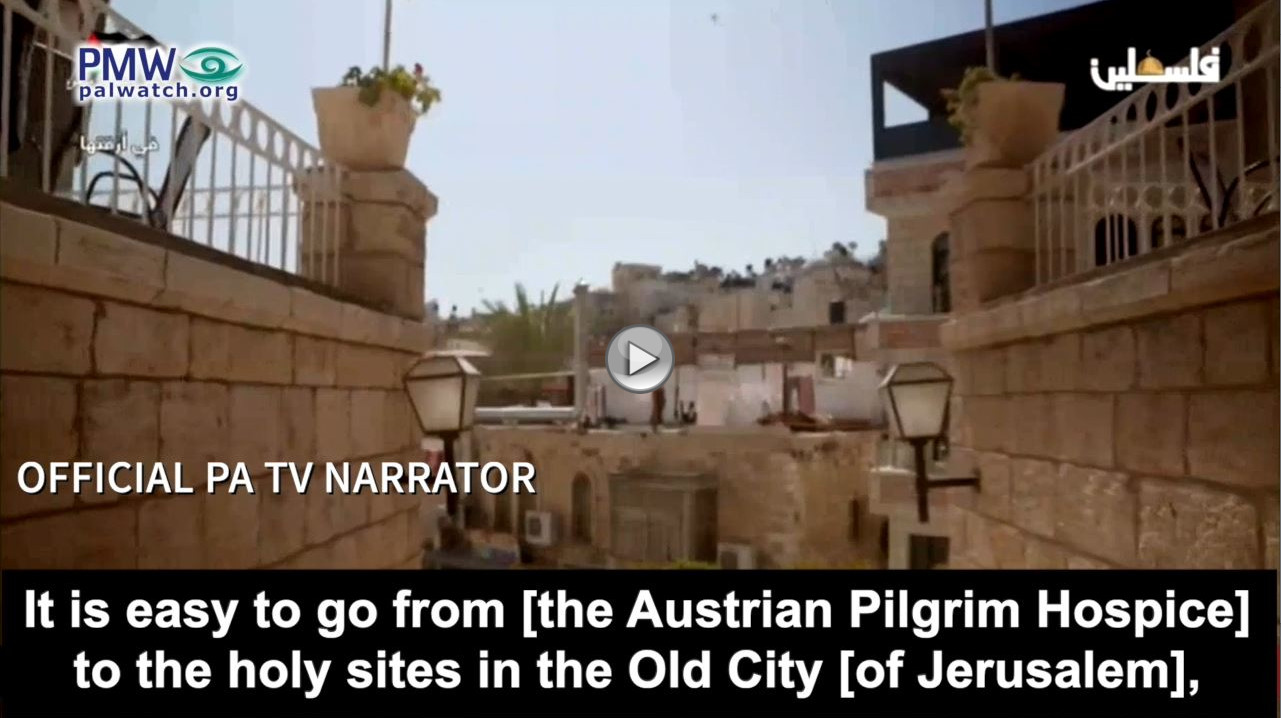Official PA TV narrator: “It is easy to go from [the Austrian Pilgrim Hospice] to the holy sites in the Old City [of Jerusalem], such as the Church of the Holy Sepulchre, the blessed Al-Aqsa Mosque, the Islamic Al-Buraq Wall (i.e., the Western Wall), and even the Mount of Olives.”