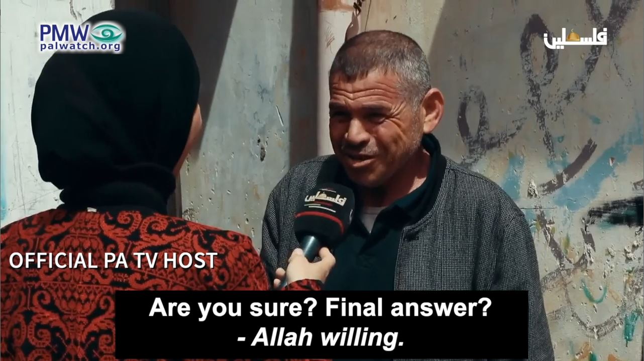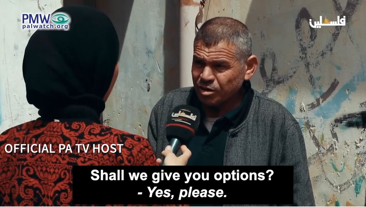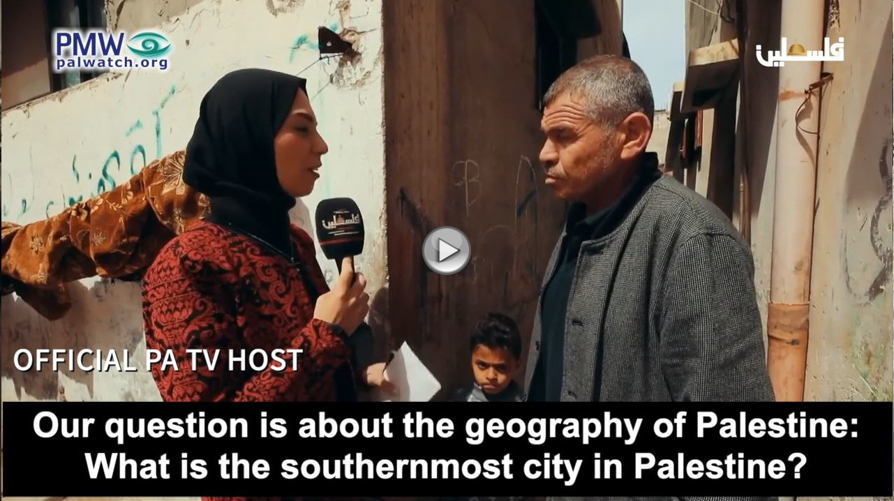 Official PA TV host: “Our question is about the geography of Palestine: What is the southernmost city in Palestine? Shall we give you options?”