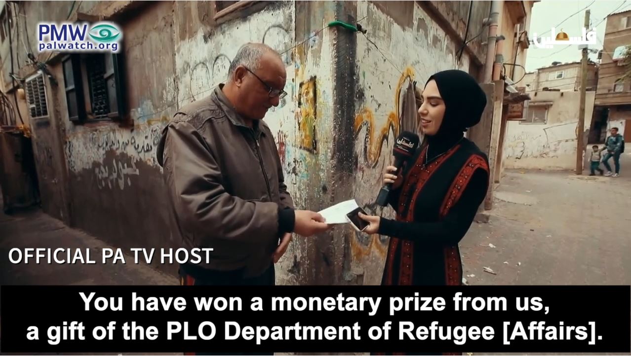 Host: “Correct answer, 360 km is the length of the borders between Palestine and Jordan. You have won a monetary prize from us, a gift of the PLO Department of Refugee [Affairs].”