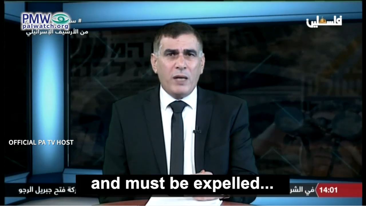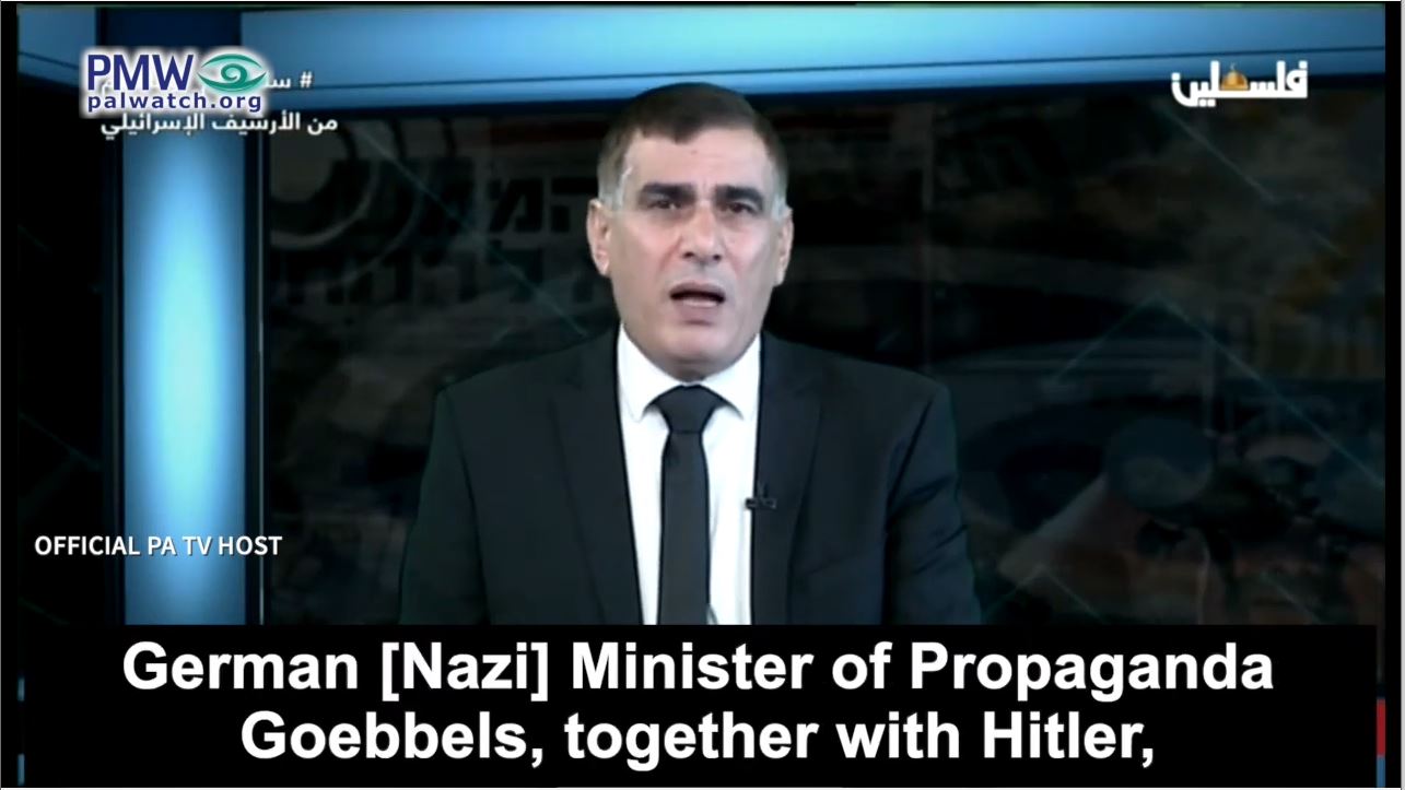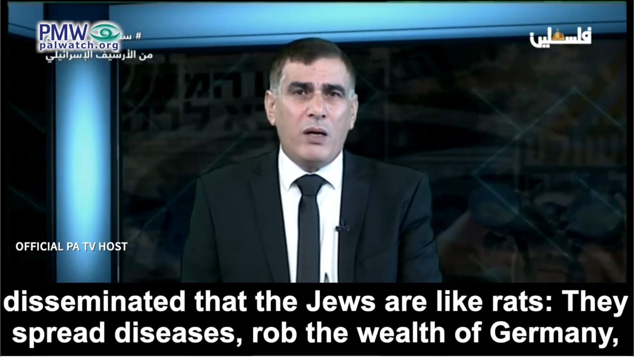 Official PA TV host: “How was the expulsion (i.e., the Nazi genocide) of the Jews carried out? German [Nazi] Minister of Propaganda Goebbels, together with Hitler, disseminated that the Jews are like rats: They spread diseases, rob the wealth of Germany, and must be expelled... They reached the land of Palestine hungry, sick, lacking everything, infected with typhus and malaria. We gave them fresh water to drink and fed them oranges, and they betrayed the hand that was extended to help them.”