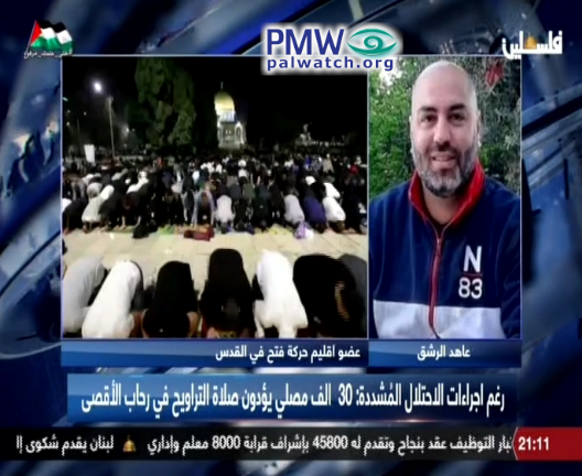 Fatah Jerusalem Branch member Ahed Al-Rishq: “We say to our Palestinian people everywhere that they should direct their steps to the blessed Al-Aqsa Mosque and come to the blessed Al-Aqsa Mosque in very large numbers so as not to give the occupation government and the settler gangs an opportunity to defile the purest place in the world, to defile the blessed Al-Aqsa Mosque… A number of days ago we saw how the Nazi occupation government attacked those fortifying in the blessed Al-Aqsa Mosque, how it attacked the elderly, the young, the children, and the lauded women in the Al-Aqsa Mosque and arrested more than 400 of them (refers to Israeli forces removing Arab rioters who had barricaded inside the mosque with rocks and fireworks, which they threw and fired at the forces -Ed.), but the next day we saw thousands of people fortifying in the Al-Aqsa Mosque…