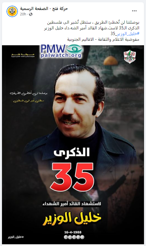 The 35th anniversary of the death as a Martyr of commander Prince of the Martyrs Khalil Al-Wazir [‘Abu Jihad’] (i.e., terrorist, responsible for murder of 125)