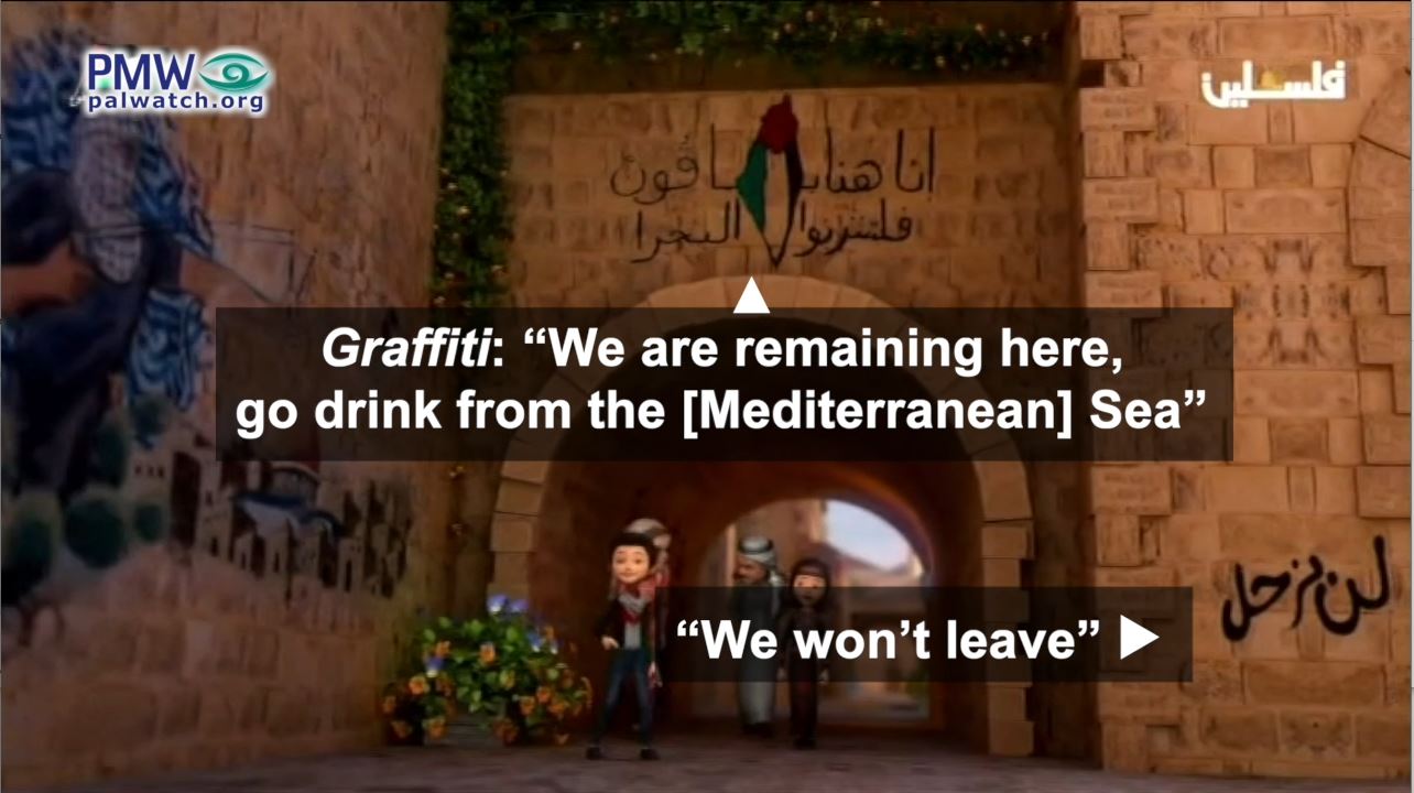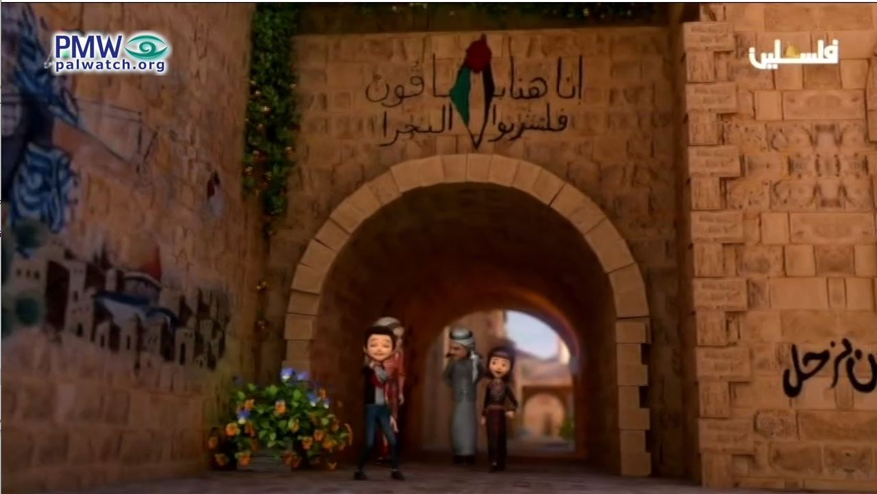 The filler shows two Palestinian children running through the Old City of Jerusalem. On the stone wall is graffiti showing the PA map of “Palestine” that presents all of Israel as “Palestine” in the colors of the Palestinian flag. Around the PA map is written: “We are remaining here, [Israelis] go drink from the [Mediterranean] Sea” and on the wall in the bottom right corner is written: “We won’t leave.” On the wall to the left is graffiti of a masked man holding a slingshot. The short animation ends with the text: “Palestine unites us.” [Official PA TV, April 20, 2023]