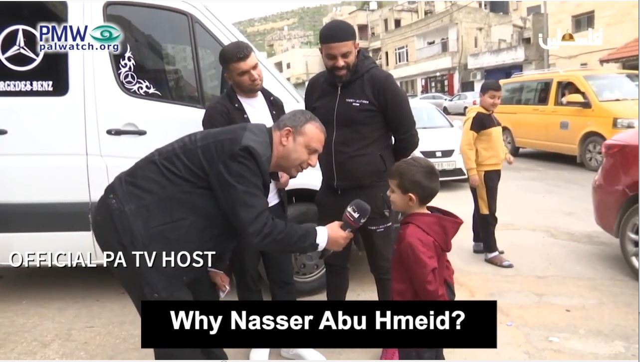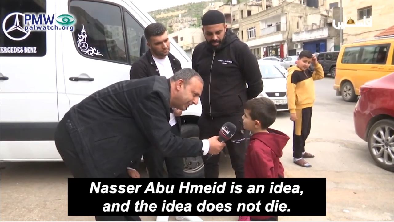Asked why he was named Nasser, the boy explained that he was named after Nasser Abu Hmeid – a terrorist responsible for the murder of 7 Israelis (see below.) Explaining why he was named after the murderer, the boy said about him that he was “an idea, and the idea does not die.” This glorification of a terrorist murderer prompted the PA TV reporters to give the boy the monetary prize without even asking the boy’s father a question: