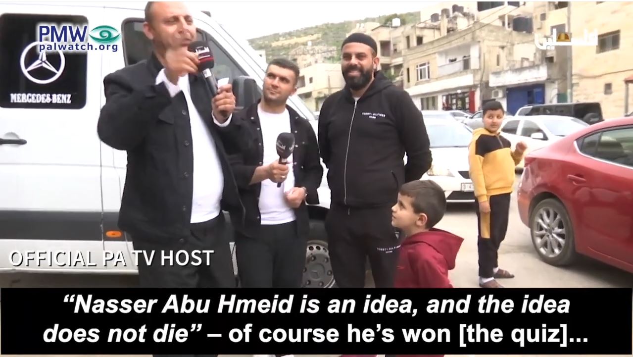 Host: “‘Nasser Abu Hmeid is an idea, and the idea does not die’ – of course he’s won [the quiz]… ‘Nasser Abu Hmeid is an idea, and the idea does not die’ – this is for you.”