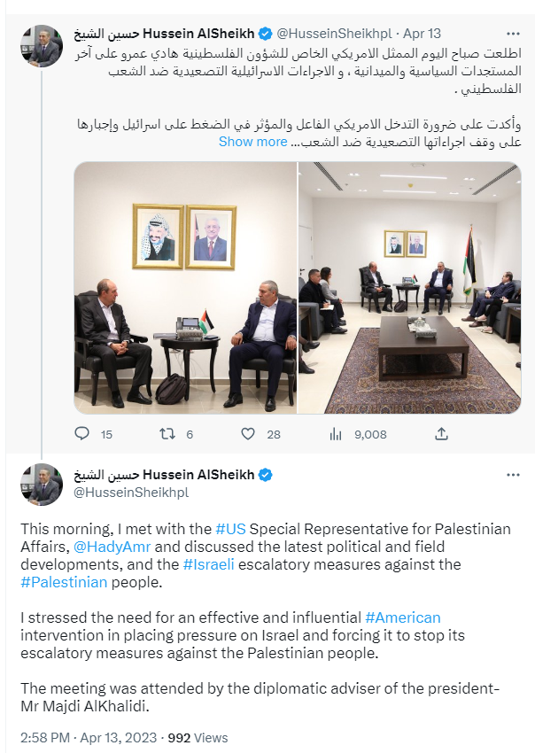 [Twitter account of Hussein Al-Sheikh, April 13, 2023]