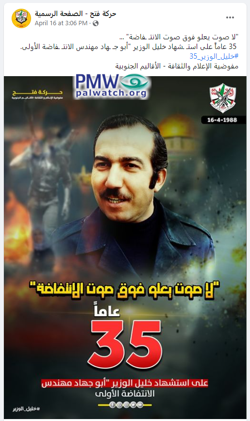 The image shows terrorist Khalil Al-Wazir “Abu Jihad,” who was responsible for the murder of 125 people. In the background on the left is a uniformed figure carrying a shoulder-fired missile, and on the right is the Dome of the Rock. In the upper right is the Fatah logo that includes a grenade, crossed rifles, and the PA map of “Palestine” that presents all of Israel together with the PA areas as “Palestine.”