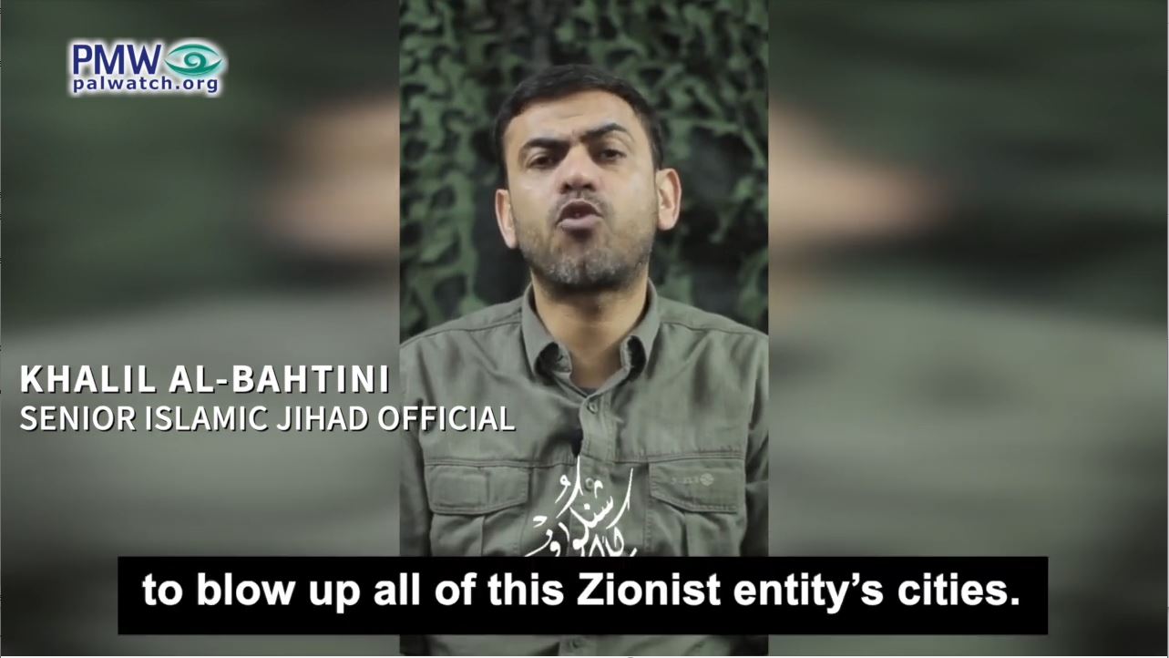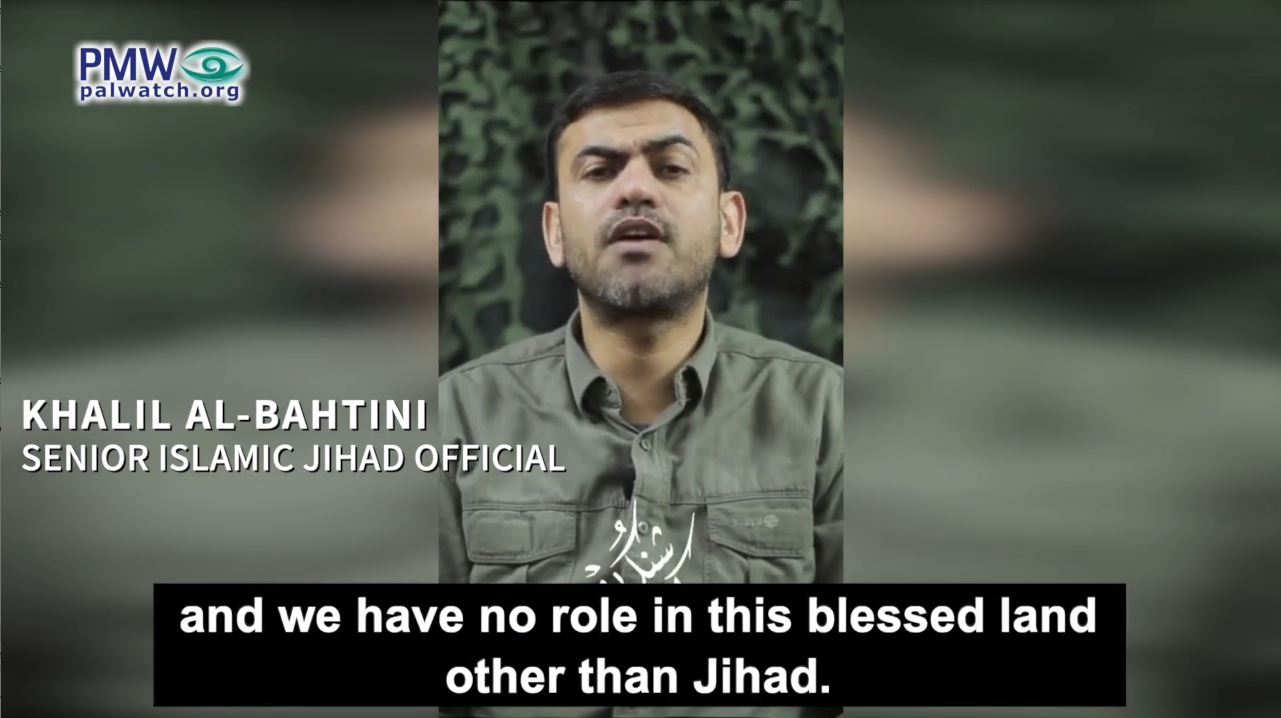Senior Islamic Jihad official Khalil Al-Bahtini: “What we were educated on, and [what] our culture is, is that whoever lives on this land and does not merit Martyrdom, he has lost out. Allah has honored us in this land with Ribat (i.e., religious conflict over land claimed to be Islamic) and Jihad, and we have no role in this blessed land other than Jihad.It is our honor, all the honor, that we are fighting against Israel, this thieving entity, and that we are educating our sons to hate this entity.It is our honor that we are continuing with all our days, efforts, and intentions to blow up all of this Zionist entity’s cities. Thus we will record in history that the resistance fighters of Palestine, and the resistance fighters of the Gaza Strip, were like a thorn in the throat of this entity, and that they did not negotiate and did not renounce a [single] grain of soil of this land.”