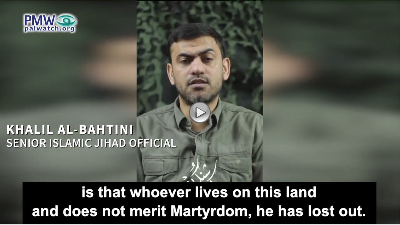 The PA, Hamas, and PIJ all present dying as a “Martyr” as a positive achievement. In this video, Al-Bahtini said that failing to achieve “Martyrdom” is a loss: “Whoever lives on this land and does not merit Martyrdom, he has lost out.”