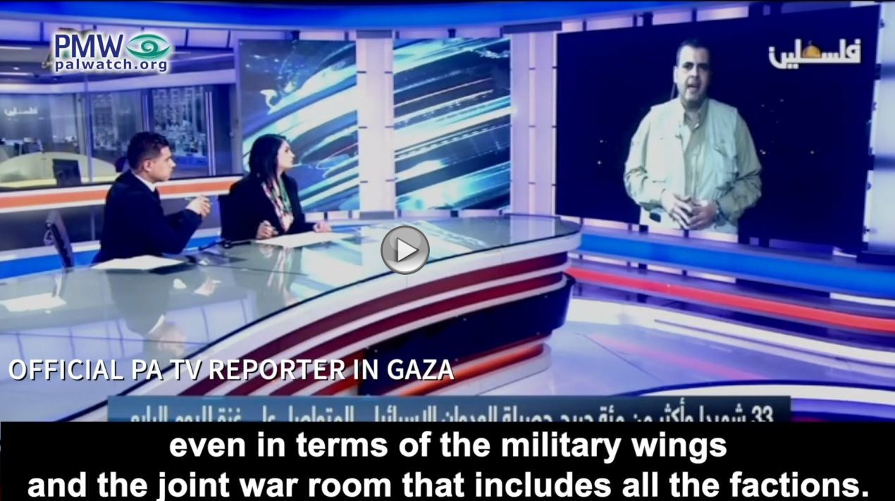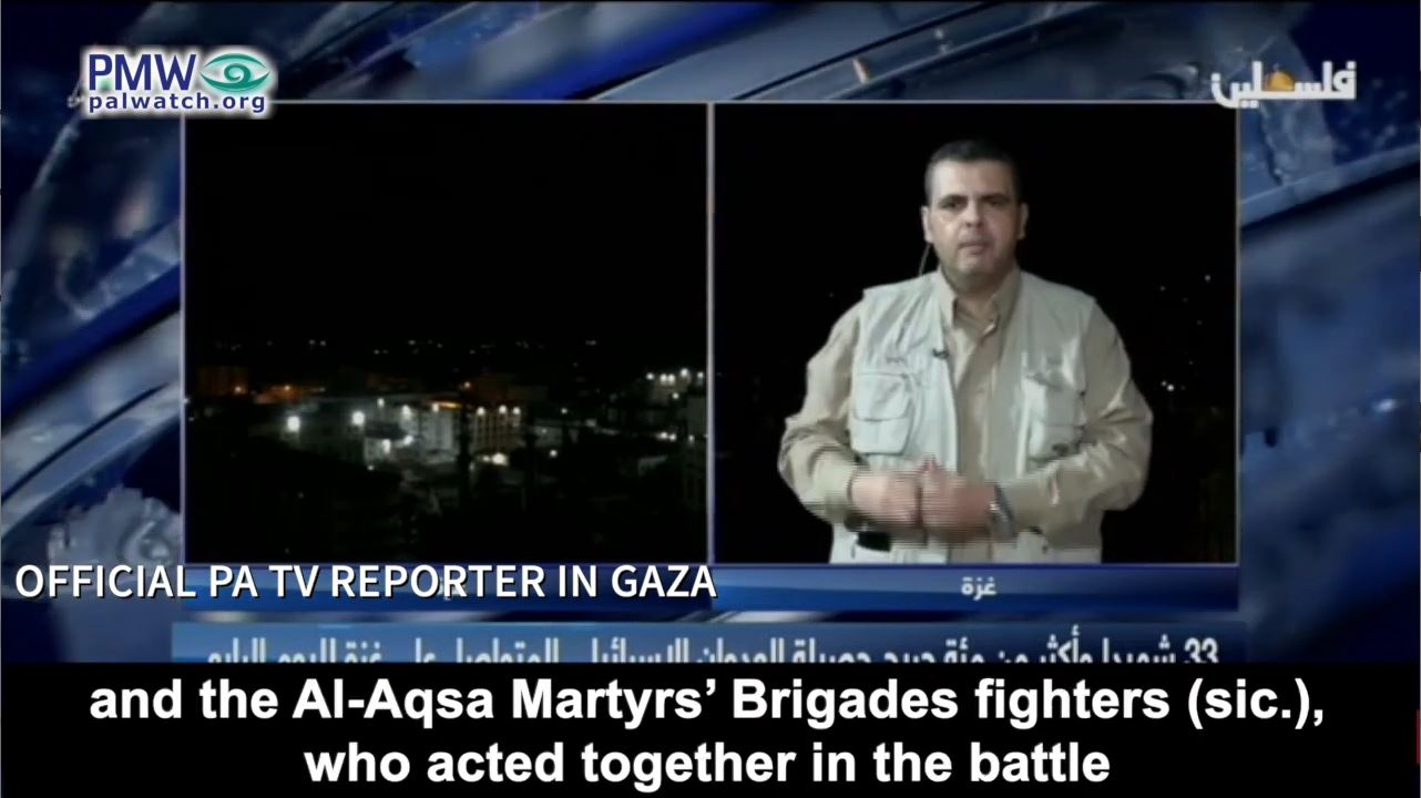 Official PA TV reporter in Gaza: “That’s true. We see that in the Gaza Strip, even in terms of the military wings and the joint war room that includes all the factions. The Al-Aqsa Martyrs’ Brigades (i.e., Fatah’s military wing) and Fatah are actually considered the spearhead in this war room… In this battle, when we speak about the factions that participated in it and about what’s called on social media ‘partners in blood,’ the intent is mainly the Al-Quds Brigades fighters (i.e., Islamic Jihad’s military wing) and the Al-Aqsa Martyrs’ Brigades fighters (sic.), who acted together in the battle as a response to the assassinations of the Al-Quds Brigades members.”