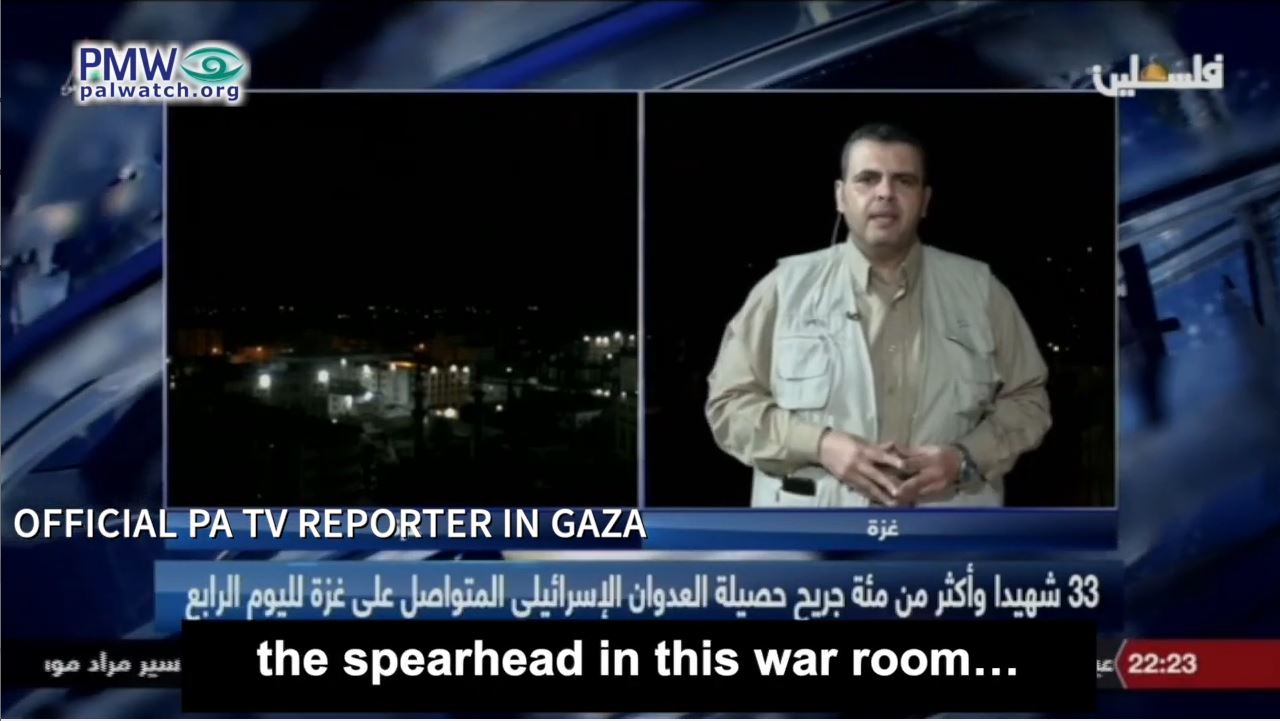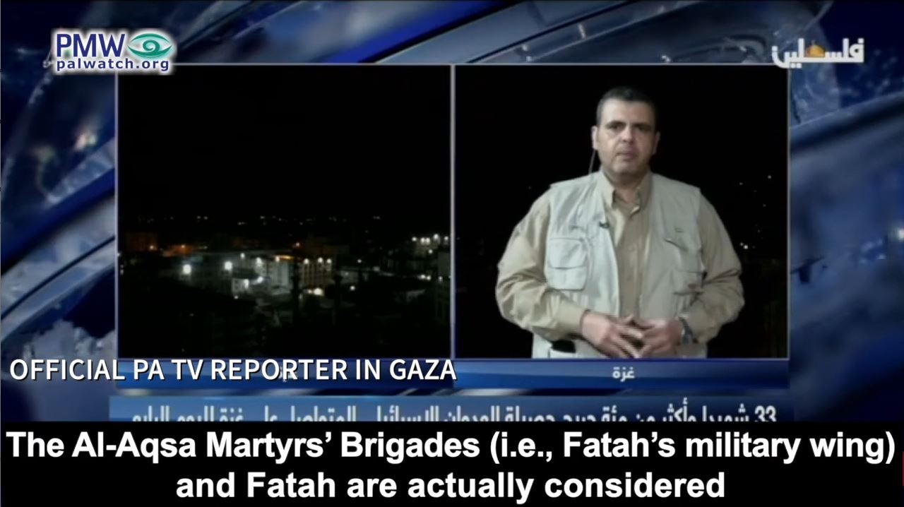 By contrast, Abbas’ Fatah Movement did not participate in the Gaza terrorists’ fight against Israel. However, Fatah needs to profile itself as leading the Palestinians and “a pioneer in armed struggle.” The terror organization Hamas didn’t join the recent hostilities either, but polls show its popularity is greater than Fatah even in the West Bank. Therefore, Fatah wants to be seen as if it is “on the barricades” along with the Gazan terrorists. This became evident when the official PA TV reporter in Gaza glorified Fatah and its military wing the Al-Aqsa Martyrs’ Brigades as being “considered the spearhead in the war room” and claimed that Fatah’s military wing and Islamic Jihad’s military wing are those who “acted together” as “partners in blood” against the Israeli “aggression”: