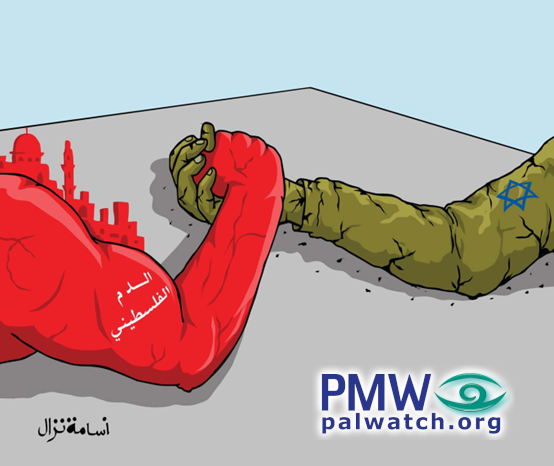 The cartoon shows two arms engaged in an arm-wrestling match. On the left is a red muscular arm with mosques on it and “Palestinian blood” written on it, and it is defeating an Israeli military khaki green arm on the right that has a blue Star of David on it and is cracking and crumbling.