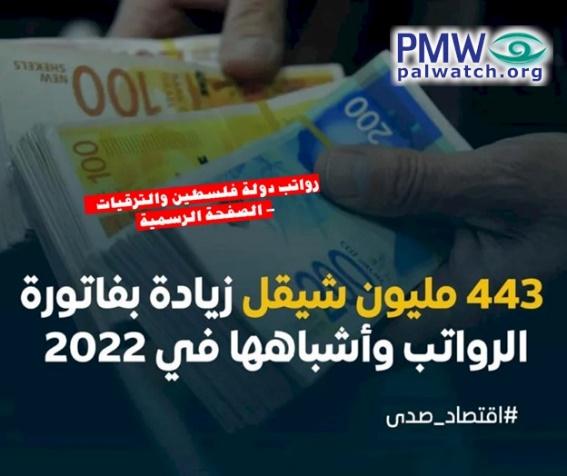 An addition of 443 million [Israeli] shekels to the cost of the salaries and salary-like payments (i.e., includes pension payments and allowances to terrorist prisoners and to the families of dead terrorists) in 2022.
