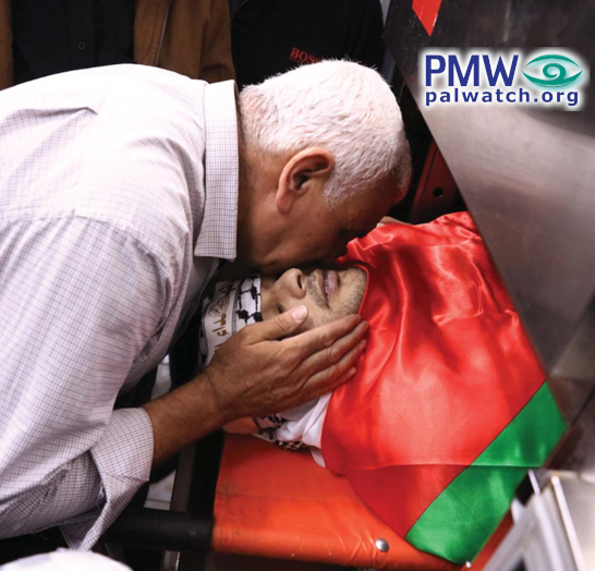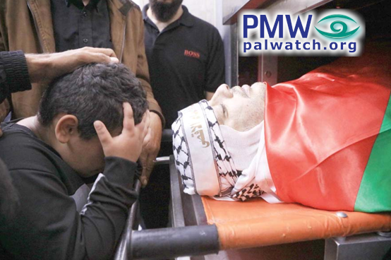 The article includes pictures of terrorist Ashraf Ibrahim’s dead body, which is wrapped in a Palestinian flag and a keffiyeh and is wearing a headband with “Al-Aqsa Martyrs’ Brigades,” Fatah’s military wing, written on it.