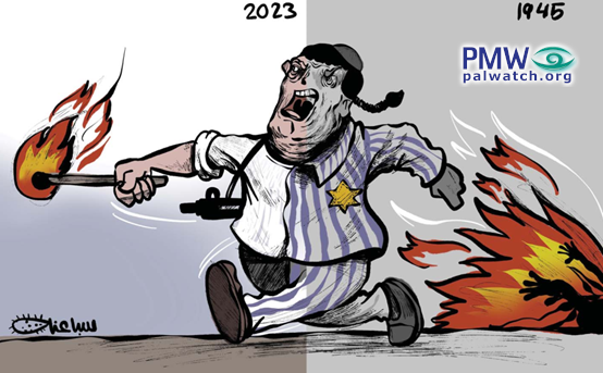 The cartoon is split into two halves, with the right half marked “1945” and colored gray to indicate a black-and-white photo, and the left half marked “2023.” In the center of the cartoon running from the 1945 half to the 2023 half is a grotesque depiction of a Jew with peot (Jewish traditional sidelocks) and a kippah (Jewish skullcap). The right side of the Jew in the 1945 half is dressed in a Nazi death camp prisoner uniform with a yellow Star of David badge, and he is running away from a massive fire. The left side of the Jew in 2023 is depicted as a “settler” with an assault rifle slung over his shoulder and carrying a torch to apparently burn Palestinians and Palestinian property.