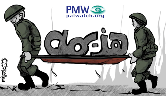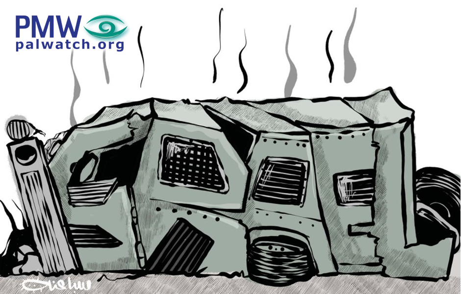Mocking the Israeli forces, the PA published two cartoons. In reference to the Palestinian success wounding Israeli soldiers with a roadside bomb, one cartoon shows two uniformed Israeli soldiers carrying a stretcher with the word “Defeat” on it in place of a wounded person.