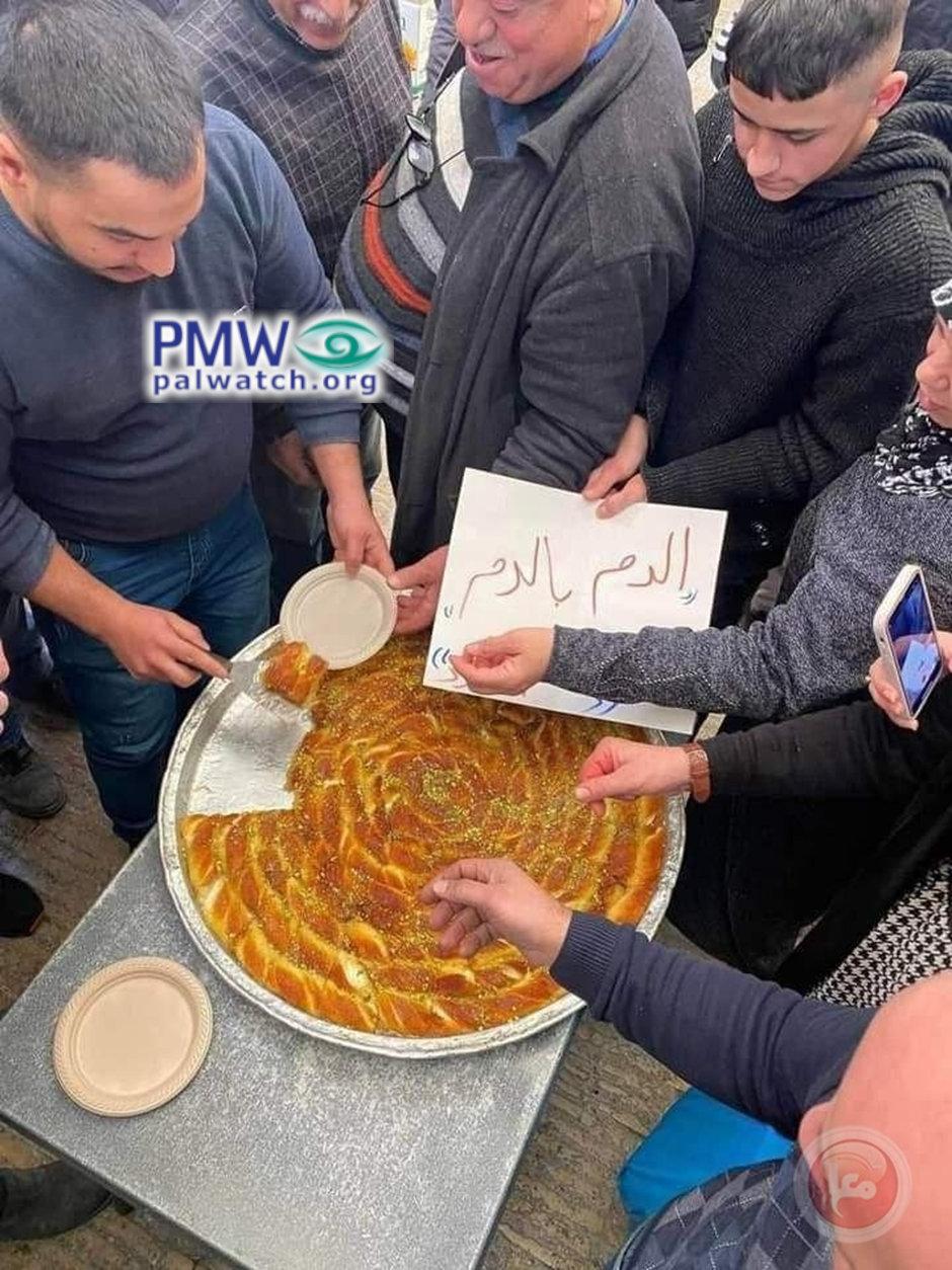 Stressing the connection between the murder of the 4 Israelis, the independent Palestinian news agency Ma’an posted a photo of Palestinians sharing a big dish of pastry while one holds a sign saying “blood for blood”: