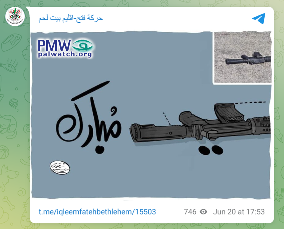 The cartoon features a drawing of the same rifle with dots and lines added to it, creating the word “holiday” (eid), followed by the word “blessed” (mubarak), which together form the greeting “Eid Mubarak” meaning “Happy holiday,” in both a reference to the upcoming Muslim “Sacrifice Feast” holiday of Eid Al-Adha and a celebration of the lethal terror attack. [Fatah Movement – Bethlehem Branch, Telegram channel, June 20, 2023]