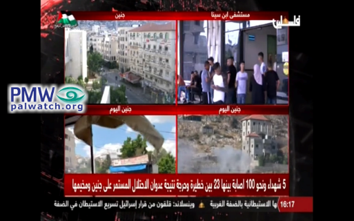 Official PA TV newsreader: “In Jenin [Israeli] military vehicles were damaged, and the occupation attempted for four hours to evacuate them from the Jenin [refugee] camp to the occupied Palestinian Interior (i.e., Palestinian term for Israel), but the brave resistance that we saw today in the refugee camp prevented the Israeli occupation from evacuating them unimpeded.” …