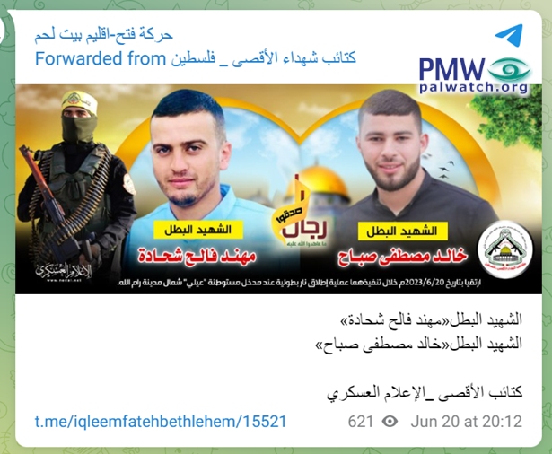 [Fatah Movement – Bethlehem Branch, Telegram channel, June 20, 2023; Al-Aqsa Martyrs’ Brigades – Palestine, Telegram channel, June 20, 2023]
